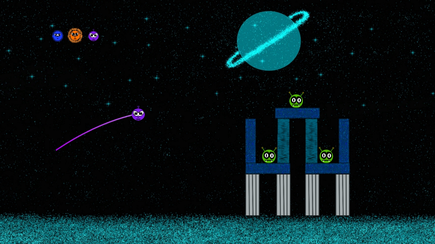 The image above is a screenshot from level 1 of the modified Angry Birds game. The game is set in outer space and the player takes control of the protagonist aliens to destroy the antagonist aliens. The player makes use of a slingshot mechanic that allows the player to launch the protagonist aliens at the enemy. This game was created as a second-year assignment for WSOA2006A. The aim of the assignment was to gain technical competence in re-creating the Angry Birds game. The player must right-click on the protagonist avatar, aim, and release the right-click to launch. The player has a limited number of attempts with different aliens. Each alien has unique characteristics such as speed, explosion effects and maximum distance. Furthermore, the pillars on which the enemies stand on have different strength factors. The level is completed once the player destroys all the green aliens.